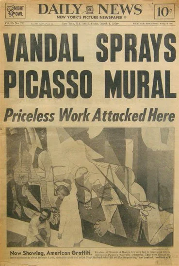 28 Şubat 1974 sanat dünyası için ilginç bir gündü. İranlı bir genç, Amerika Birleşik Devletleri’nin Vietnam politikasını protesto etmek için bir sanat eserini kullanmaya karar vermişti. Savaş trajedisi denilince akla gelen ilk eserlerden olan Picasso’nun Guernica’sı, MoMA’da sergilendiği dönemde Vietnam Savaşı karşıtlarının toplanma noktası ve eylem yeri konumundaydı. Fakat o güne kadar yapılan hiçbir eylem Tony Shafrazi’ninki kadar ses getirmedi. Shafrazi mesajını kırmızı sprey boyayla Guernica üzerinden tüm dünyaya duyuruyordu: “Kill Lies All” (Tüm Yalanları Öldürün). Müzenin güvenlik görevlilerince yakalanan Shafrazi “küratörü çağırın, ben bir sanatçıyım” dese de, polisler eşliğinde karakolun yolunu tutarken, vernikli olduğu için ucuz kurtulan Guernica bir saat içinde temizlenecekti.[1]