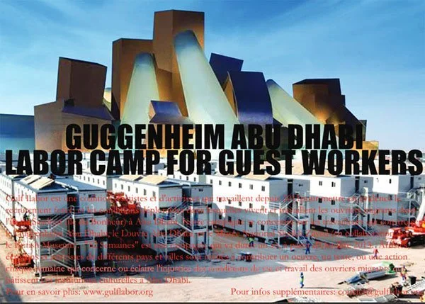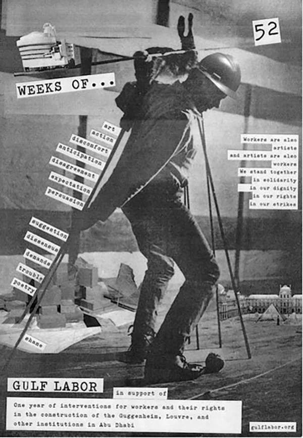 Abu Dhabi’deki Saadiyat Adası’nda yer alan müzelerin inşaatı başladıktan sonra İnsan Hakları İzleme Örgütü gibi sivil toplum kuruluşları ve Gulf Labor, müze inşaatlarında çalışan işçilerin hak ihlallerinin giderilmesi için önce Guggenheim daha sonra da projeden sorumlu olan TDIC ile görüşmelere başladı. Gulf Labor’ın çağrıları ve İnsan Hakları İzleme Örgütü’nün yayınladığı raporları karşısında Guggenheim ve TDIC sessiz kalınca, Gulf Labor Ekim 2013’te yaptığı açıklamayla bir yıl sürecek olan “52 Hafta” eylem serisini başlattı.[1] Kamuoyu baskısı yaratmak için her hafta bir sanat eseriyle Saadiyat Adası’nda zor koşullar altında çalışan işçilere dikkat çekmeyi amaçlıyorlardı.[2] Bir yıl sürecek olan eylem serisine Hans Haacke, Thomas Hirschhorn, Walid Raad, Gregory Sholette, Mariam Ghani gibi birçok sanatçı katıldı. Gulf Labor’ın “52 Hafta” eylem serisi yalnızca Guggenheim Abu Dhabi’yi değil; adada yer alan tüm kültür-sanat ve eğitim kurumlarını hedef alıyordu.