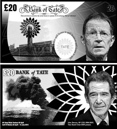 Liberate Tate grubu, Tate-BP sponsorluğunun detayları kamuoyuyla paylaşıldıktan sonra, Occupy Design[4] tarafından hazırlanan BP/Tate banknotlarıyla eylemlerine Tate Britain içindeki üyeler salonunda devam etti. Hazırlanan banknotların bir tarafında Tate direktörü Sir Nicholas Serota, diğer tarafında ise BP’nin eski CEO’su ve Tate’in mütevelli heyeti başkanı John Browne yer alıyordu. “The Reveal” (İfşaat) olarak adlandırılan eylemde siyahlar giymiş yedi eylemci toplam 240.000 BP/Tate banknotunu havaya saçarak bir anlamda Tate-BP ilişkisini ifşa etti.[5]